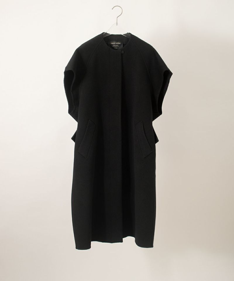 ノースリーブのコートです。 身体を包み込む様な立体裁断で、後ろ身頃の柔らかい分量感により、コートの雰囲気を持ちながら、袖がない事により軽い着用感です。 袖がないことで着られる期間も長く楽しめます。 *ラインナップはSUPPORT SURFACEギャラリーページでもご覧いただけます。 SUPPORT SURFACEのブログはこちらから