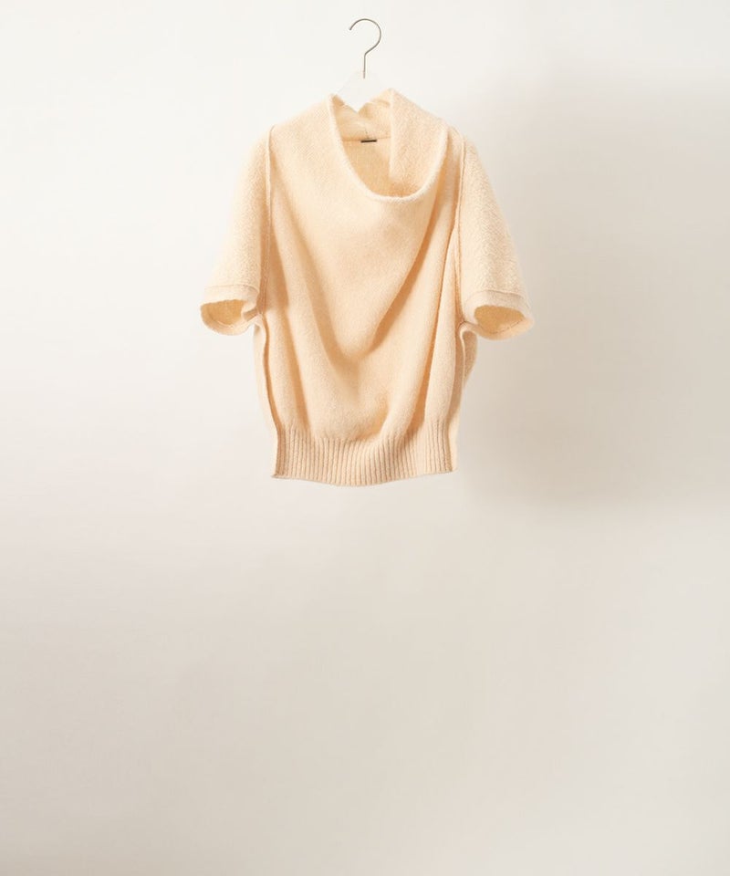 アルパカ混素材の半袖ニットです。 前身頃は編み地の表側、後ろ身頃と袖は編み地の裏側を使い、前と後ろで表情が異なります。 また分量を取った前身頃を襟部分でたたむ事によってニットでありながら綺麗なドレープ感があります。 *その他ラインナップはSUPPORT SURFACEギャラリーページでもご覧いただけます。 SUPPORT SURFACEのブログはこちらから