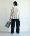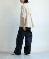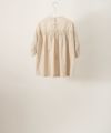 肌触りのいいコットンブロード生地を使用したブラウスは、 刺繍部分と無地部分のコントラストが個性的です。 後ろ身頃の着丈が少し長めになっています。 製品染を行っているため、独特のくしゃっと感が生まれ、 刺繍のお花が浮き上がって見えるような立体感が出ます。