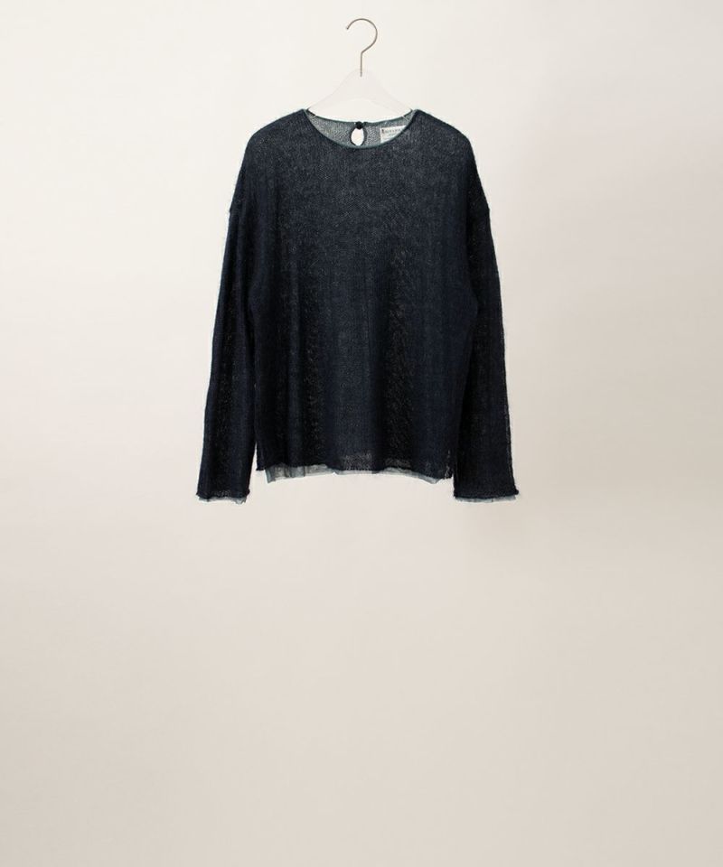 ニットとメッシュ生地を組み合わせた透け感のあるプルオーバー。 きれいな光沢感のあるシルクモヘアを使用しているので、カジュアルながらも繊細なデザインです。