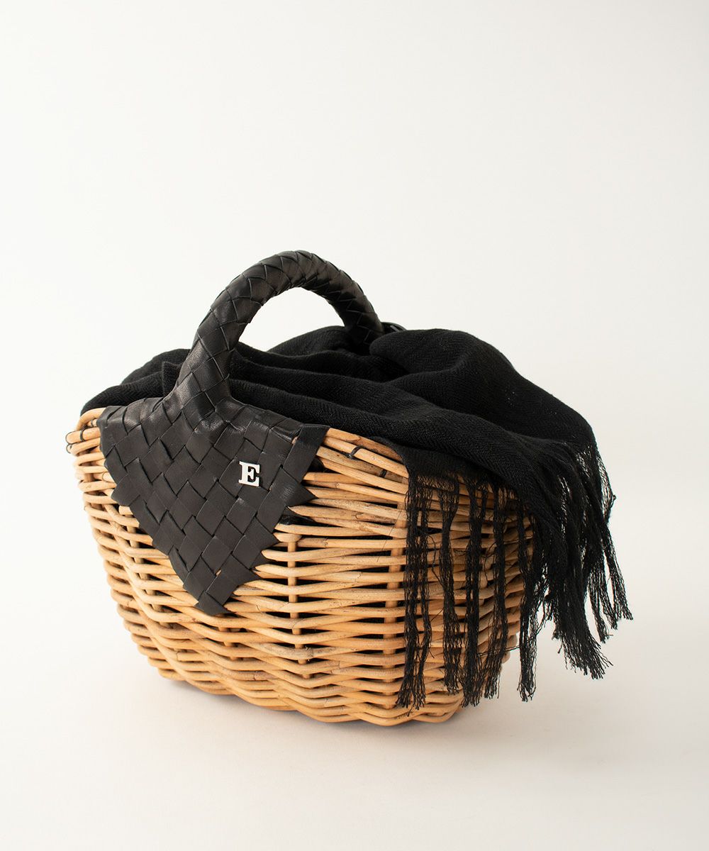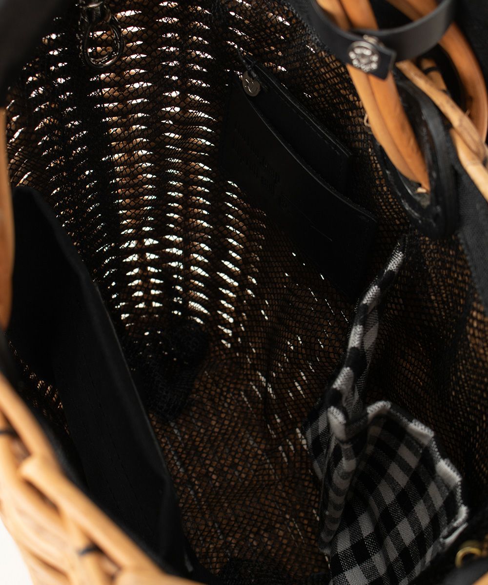 ポケット付バスケット・リネンかぶせ(籐ポケットかごバッグ)ブライドルレザー×紅籐 BLACK