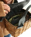 持ち手に使われているブライドルレザーは5㎜の厚さがあり、使うほどに手に馴染みます。 カゴには持ち手が通るよう、編まれています。 スイッチを入れるように装着したスイッチハンドルのシリーズです。 裏地にはチュールがつかわれているので、軽いのも特徴。 【素材】 カゴ本体に使われている籐(とう)は、「紅籐(べにとう)」と呼ばれ、24時間水につけて柔らかくするほど硬く丈夫な素材です。 使うほどに色と艶が変化していきます。 籐は自然の素材なので黒いところ赤いところと様々な表情がございます。一つ一つ職人による手仕事で作られているため個体差がございます。 【収納】 二つ折りサイフ:〇 ポーチ:〇 スマ-トフォン:〇