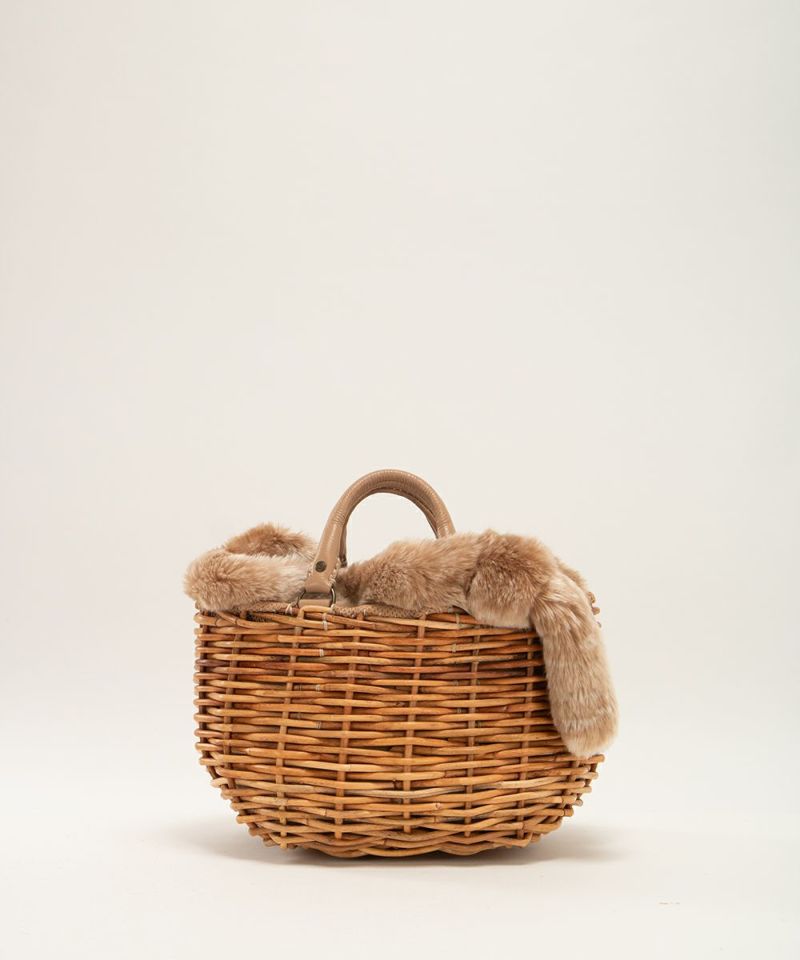 極太紅藤のみでラフな仕上がりのカゴバッグです。 ボリューミーなムードに合わせて持ち手にもスポンジ芯が使われソフトな仕上がり。 持ち手は厚みがありフニャフニャした素材のフニュシュリンク。 しっぽがついたかぶせがついており、もこもこの愛らしい佇まい。 裏地は1年中使える素材になっているので、かぶせを変えて通年愛用できるデザインになっています。 【素材】 エコファーは手触りの良さを追求し、糸の断面が扁平になっている糸を使用し、ブレンドして編まれているのでパイルの根元と毛先に色の変化があるので、立体的にみえるファーが使われています。 お手入れはブラッシングと埃を落とすように降っていただくと良いです。 カゴ本体に使われている籐(とう)は、「紅籐(べにとう)」と呼ばれ、24時間水につけて柔らかくするほど硬く丈夫な素材です。 使うほどに色と艶が変化していきます。 籐は自然の素材なので黒いところ赤いところと様々な表情がございます。一つ一つ職人による手仕事で作られているため個体差がございます。 【収納】 長財布:〇 ポーチ:〇 スマ-トフォン:〇 ペットボトル(500ml):〇