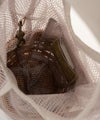 厚みの違う2種類のメッシュで表裏が作られており、カゴ部分は透け感が美しいですが、バッグの中身は透けすぎず、使うときの安心感もあります。 カゴがまるで網タイツをはいたような遊びゴコロのあるバッグです。 【素材】 メッシュは糸の太さの違うナイロンをデザインによって使い分けられてつくられています。 カゴ本体に使われている籐(とう)は、「紅籐(べにとう)」と呼ばれ、24時間水につけて柔らかくするほど硬く丈夫な素材です。 使うほどに色と艶が変化していきます。 籐は自然の素材なので黒いところ赤いところと様々な表情がございます。 一つ一つ職人による手仕事で作られているため個体差がございます。 (シーズンにより若干のデザインのチェンジ、バッグ内側の使用素材および配色の変更があることがございます。) *バッグ表面の籐の出方は個体差がございます。 【収納】 長財布:〇 スマ-トフォン:〇 ポーチ:〇