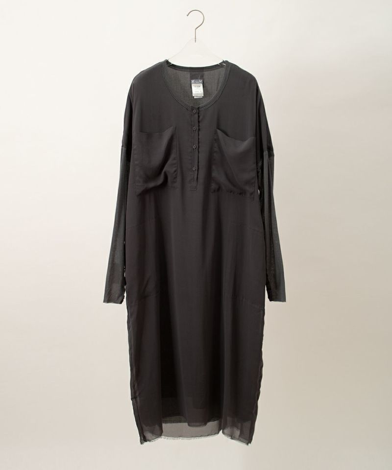 胸元の大きなポケットが特徴で、綺麗目なワンピースにカジュアル感がプラスされ、パンツと合わせてもいいバランスに。