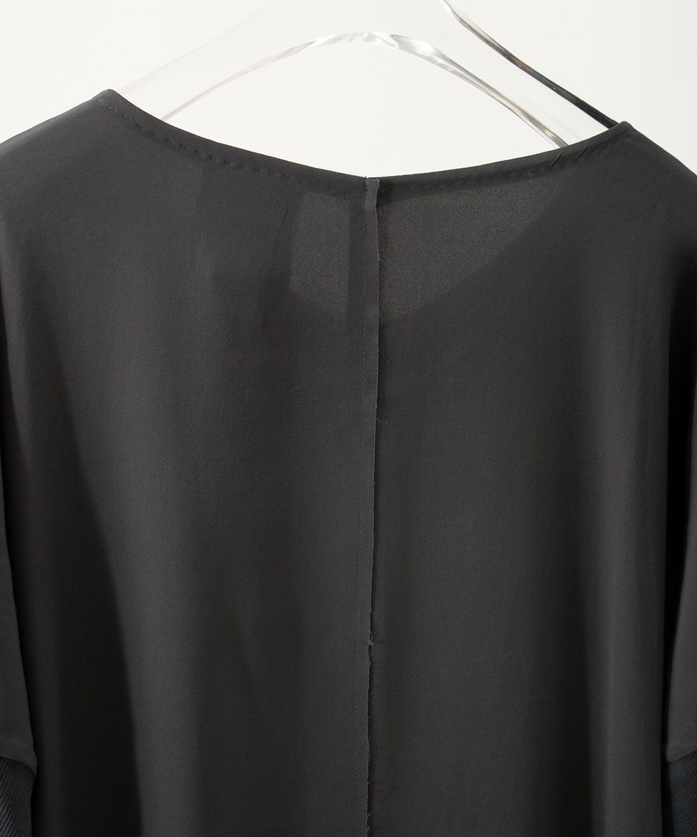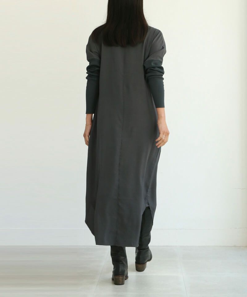 シルクストレッチ素材のワンピース。シルクにポリウレタンを合わせたことで、ストレッチ性に優れ、上品な見た目と動きやすさの機能性があるのが特徴です。