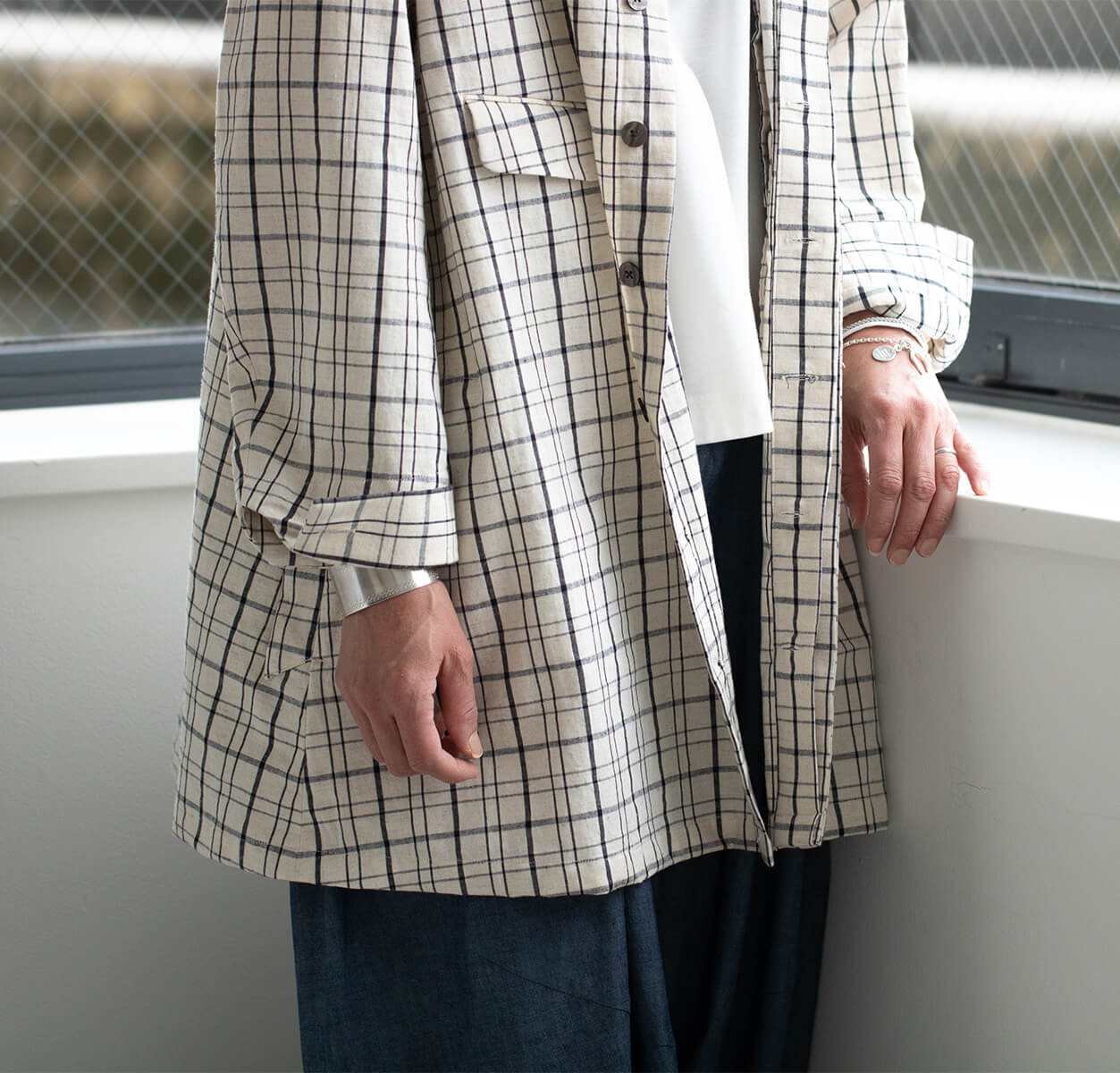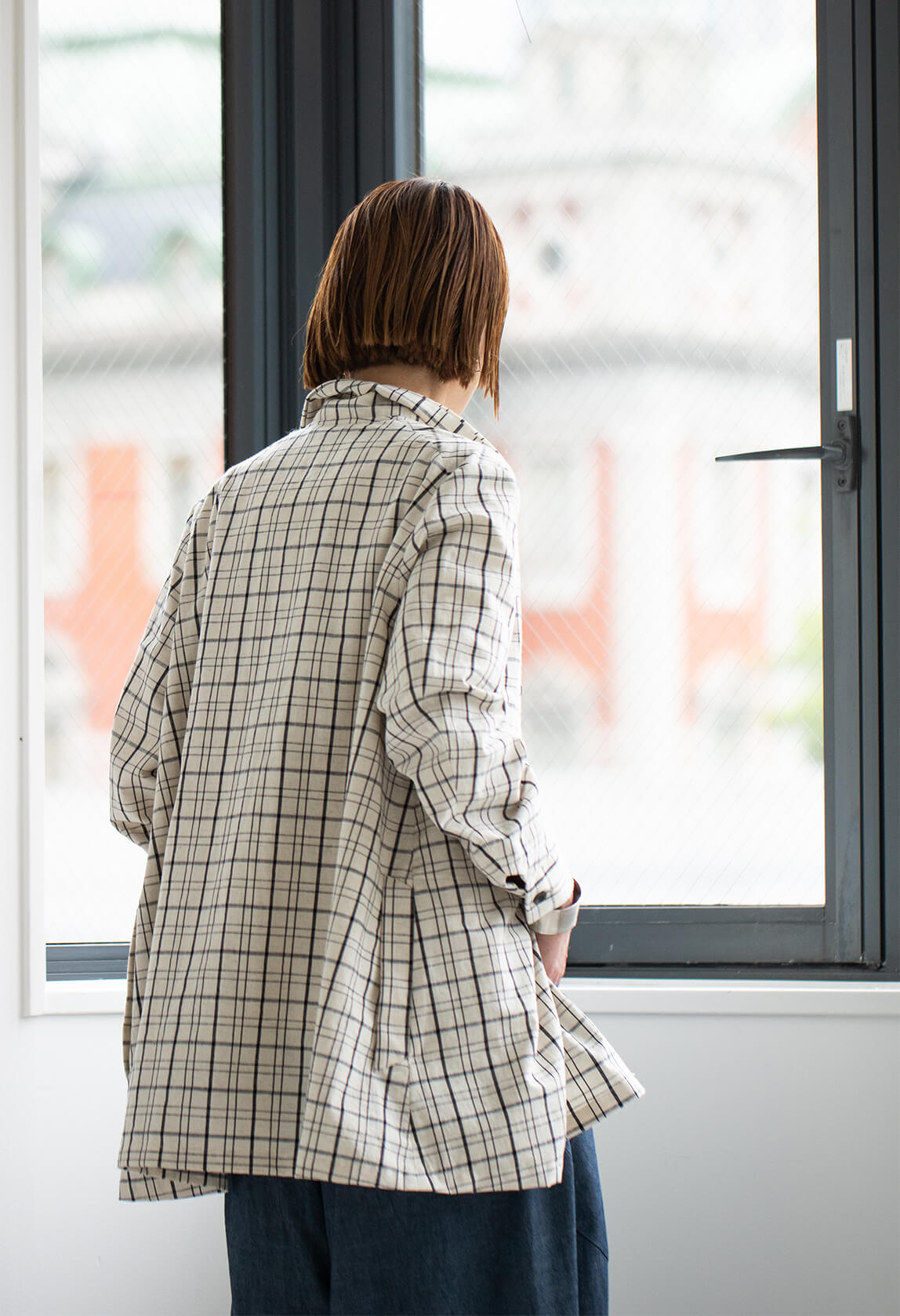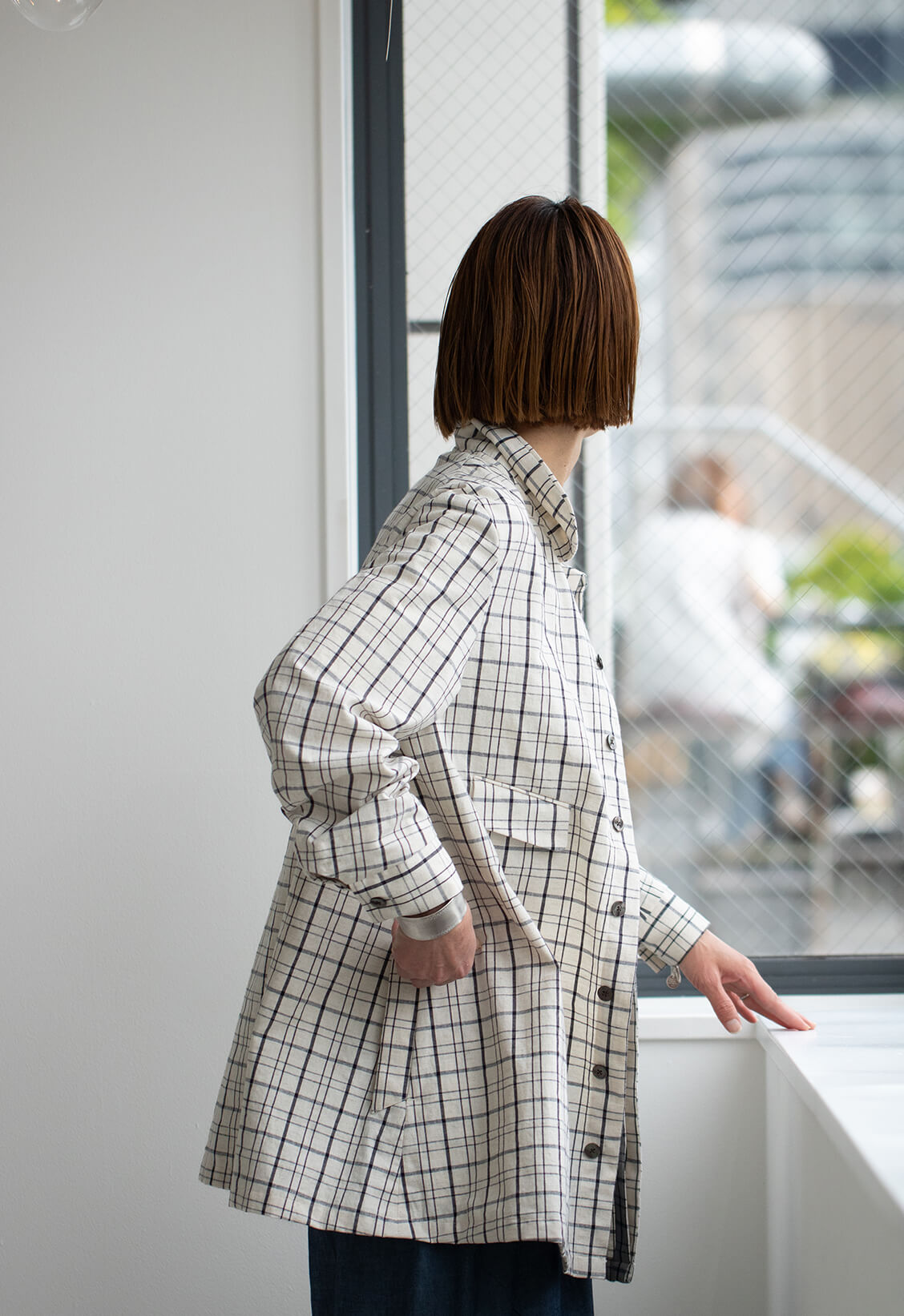「スリッポンコート マルセイユ」のチェック柄が、幾何学模様のようにも見える四角い建築と、眩しい青と白のこの街を映したようで、名前の由来となりました。