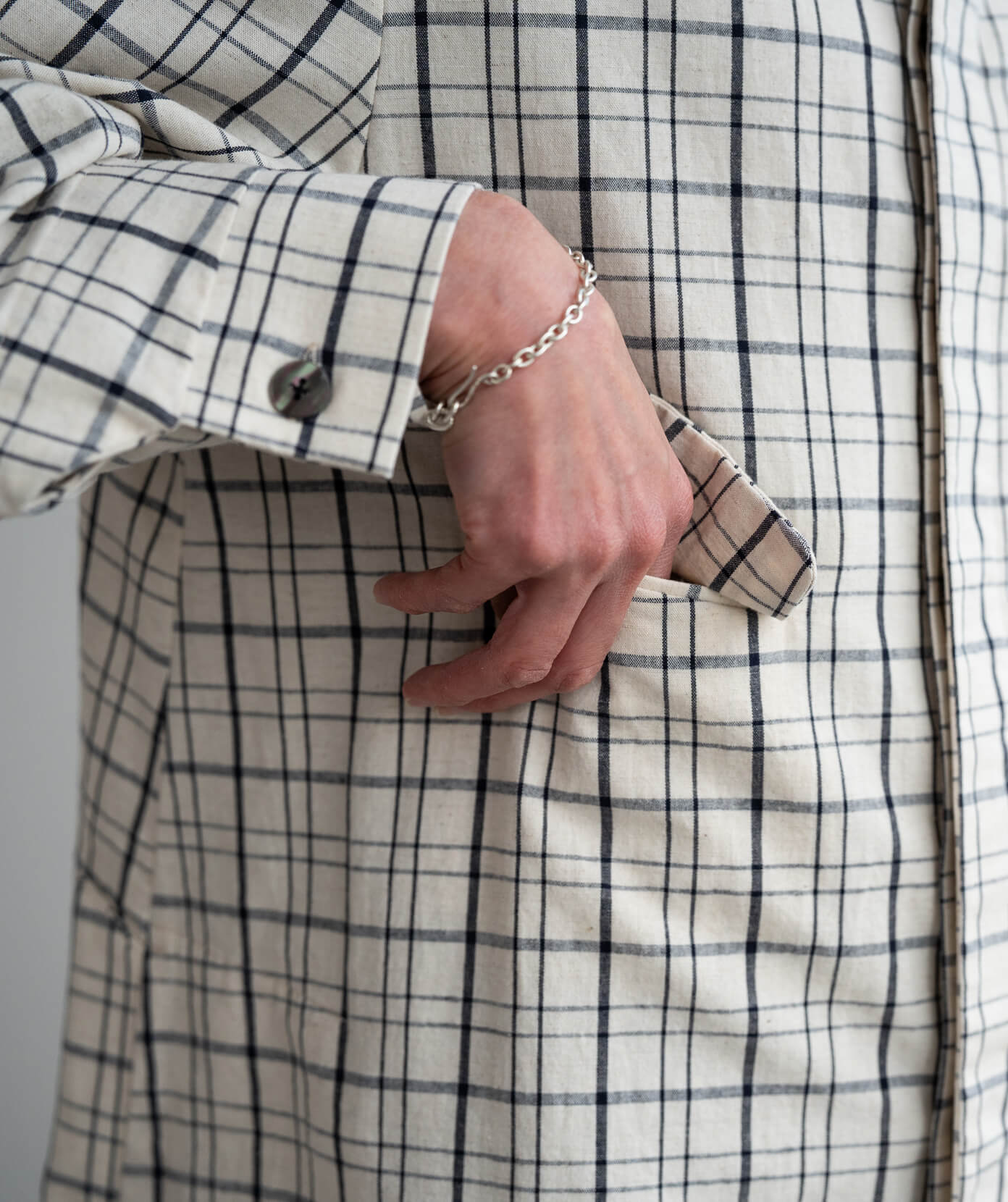 そのため前のボタンを全て止めて着ていても、中に手を通すことができます。