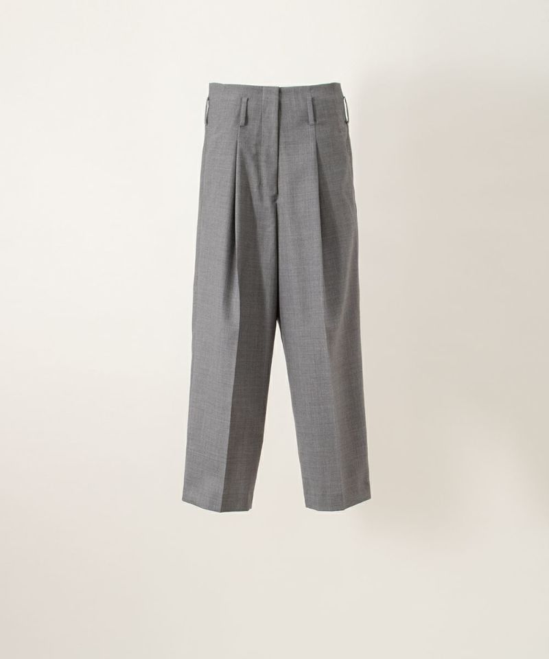 軽くしなやかな質感を持ちながら、ウール地にある綺麗な”落ち感”や上品な光沢がある点は、ワンタックがあり腰回りのゆとり感から裾に向かって、動きとともに出る陰影をより美しく魅せる素材となっています。