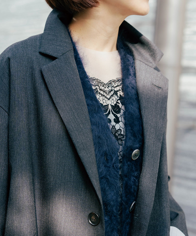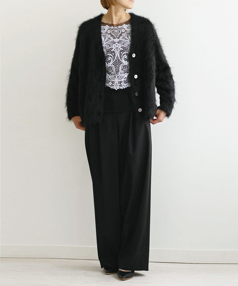 ニットカーディガンとは違った華やかさがあります。