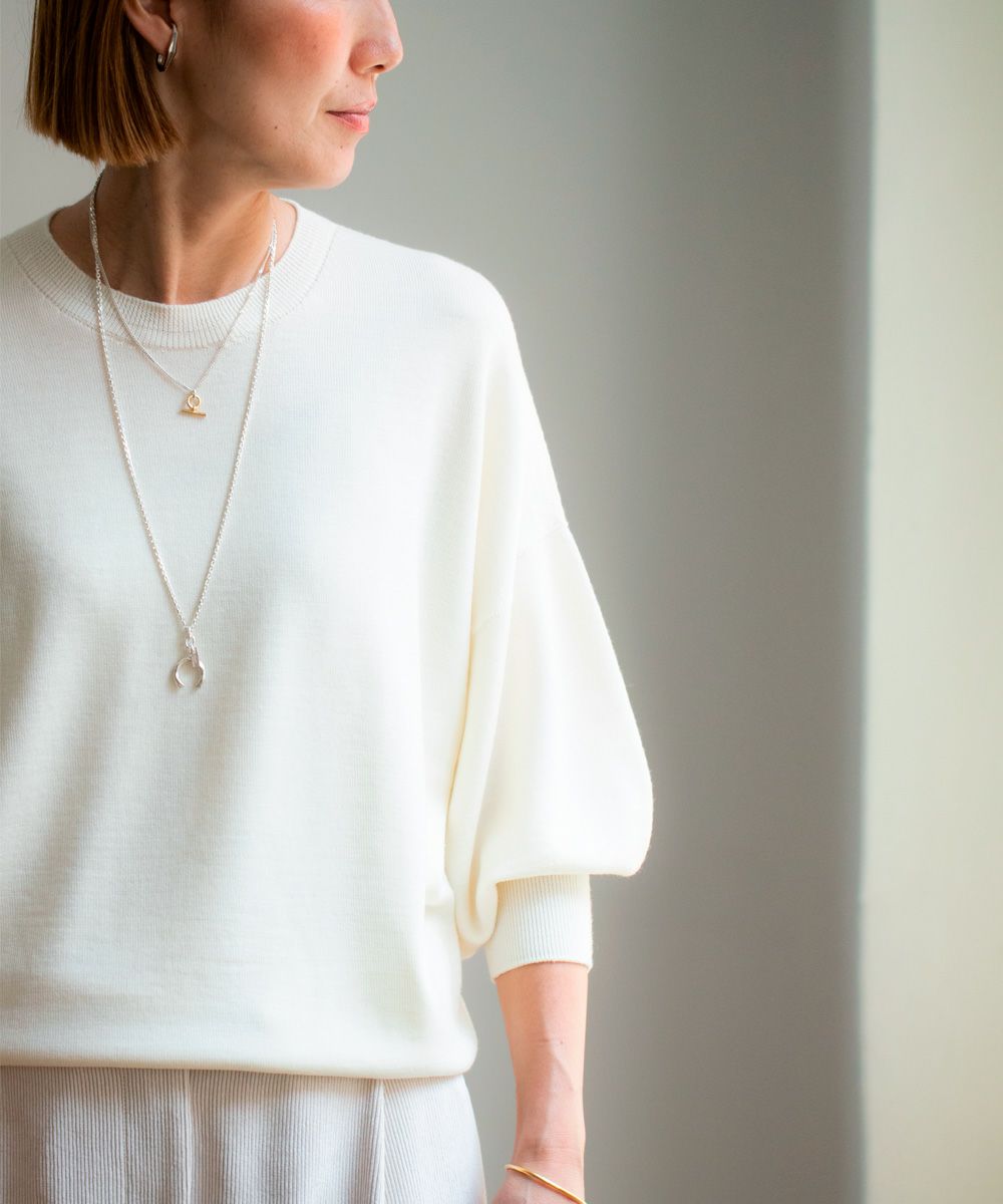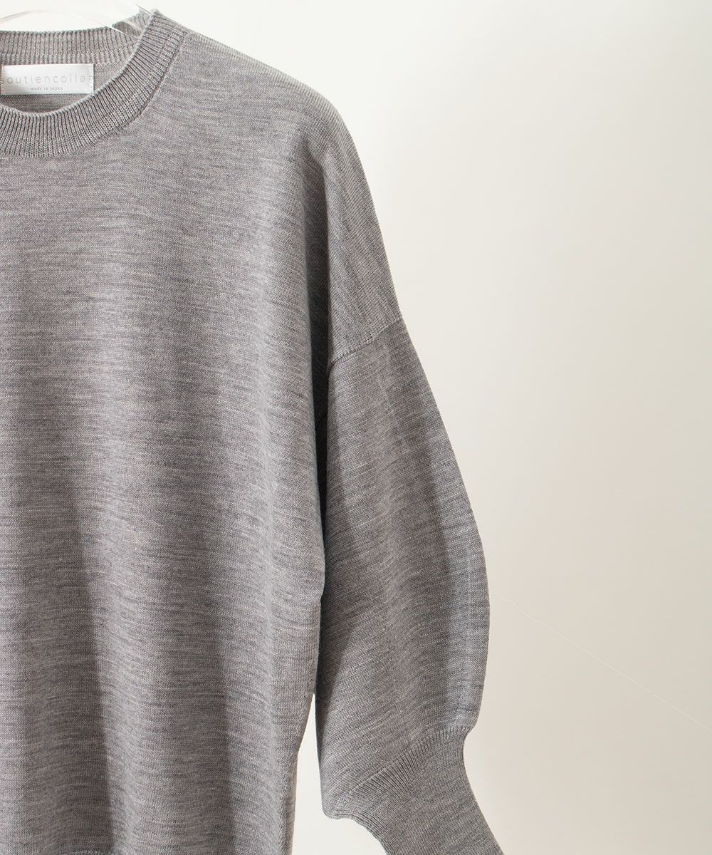 春夏の人気もの「トリコ デ サボン」のウールバージョンが新しく仲間入り。 使用されているウール素材と、秋冬という季節に合わせ、ディテールなど細かな部分も何度も微調整されてカタチになりました。 シンプルながらもぷくっとしたお袖が特徴で、着た時におしゃれ気分もふわっと膨らみます。 上質感のあるきれいめに仕上がった編み時なので、普段だけでなくオンの日にも活躍できそうです。 秋の始まりから春までとロングシーズン着られます。 「トリコ デ サボン」(春夏)の商品ページはこちらから <素材について> ウール100%。SUPER120の超極細のウールでバソラン加工をして紡績された糸。 その糸はウールの風合いを損ねることなく防縮加工を施されているため、優しい風合いと光沢感が特徴になります。 また3本撚りをすることにより糸に丸みを持たせ、きれいな目面の仕上がりとなっています。 そのため、編み地になった際にも上質感と高級感があります。 <縫製について> ホールガーメント(*A)による抜群のフィット感が実現されています。 ウール100%の天然素材でありながら、縫い代のあたりもなくしなやかな伸びで心地よさを感じられる素晴らしい着心地です。 (*A) ホールガーメント「WHOLEARMET」とは、島精機製作所の編み機を使った無縫製で編み上げるニットウェア。 従来の編み地のパーツを縫い合わせて作る「成型」との大きな違いは1枚の製品を立体的に一気に編み上げる製法にあります。 そのため、縫い合わせ部分がなくスッキリしたラインと、無理なツッパリ感のない、身体に自然に寄り添う軽やかな着心地が特徴となります。