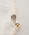 Stink Syndicateのアクセサリーはハンドメイドのため、形状や風合いが1点ずつ個体差があります。 デザイナー自身により手作業で作り進められるアクセサリーになります。 それぞれの風合いをお楽しみくださいませ。 パールのネックレスの留め具あたりにつけられたシルバーパーツには、シルバーのプレートにブランド名と馬蹄などの型押しが施されています。小さな小さなパーツを手作業で作られて、最後の仕上げにつけられているそうです。 製作した時期によって柄は変わることもあるそうで、そこはお楽しみの部分。 小さなこだわりだと、デザイナーさんが謙虚におっしゃっておられましたが、大切に作られている思いが伝わります。 どんなコーディネートにもなじむ、シンプルで存在感のあるネックレスです。