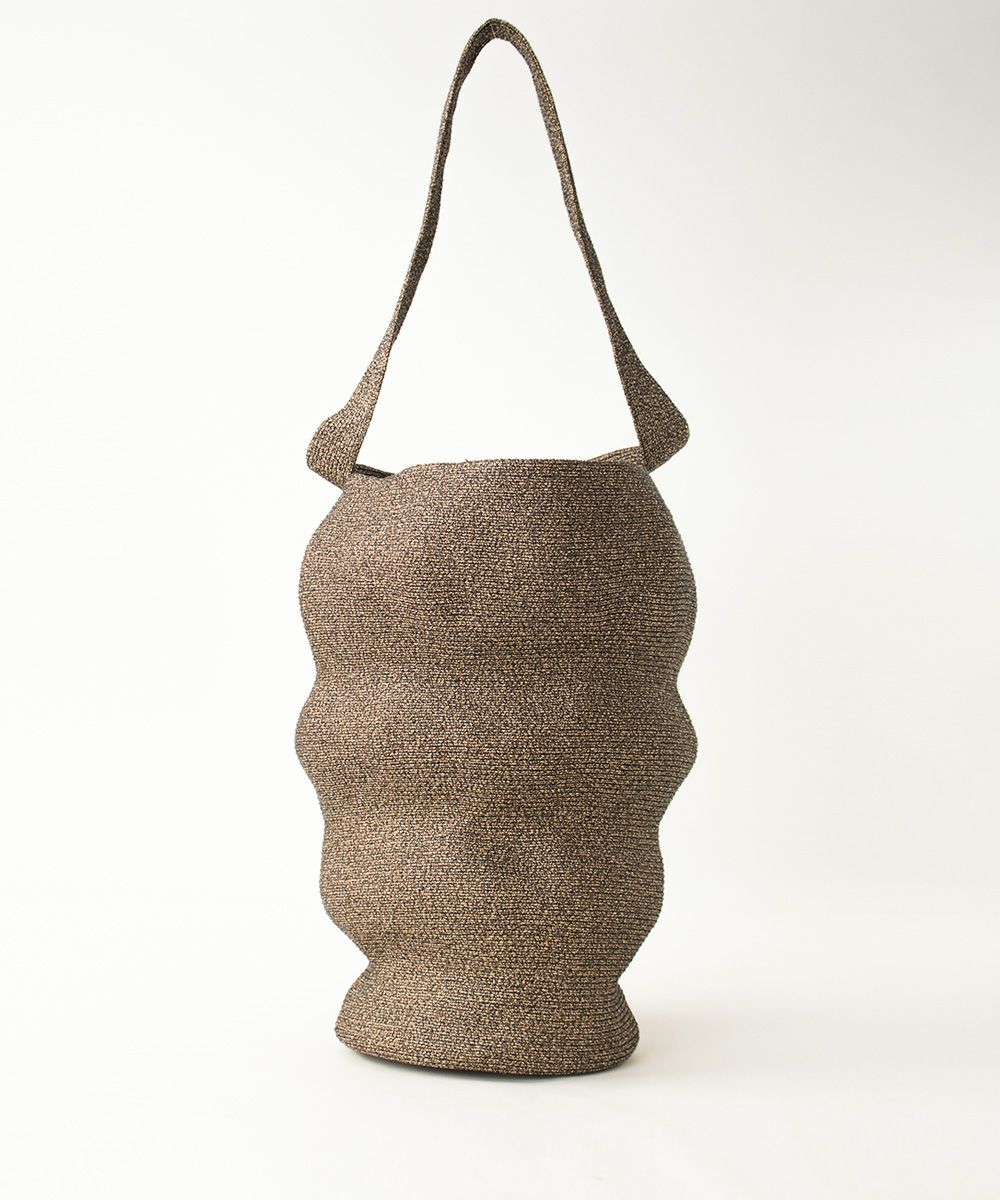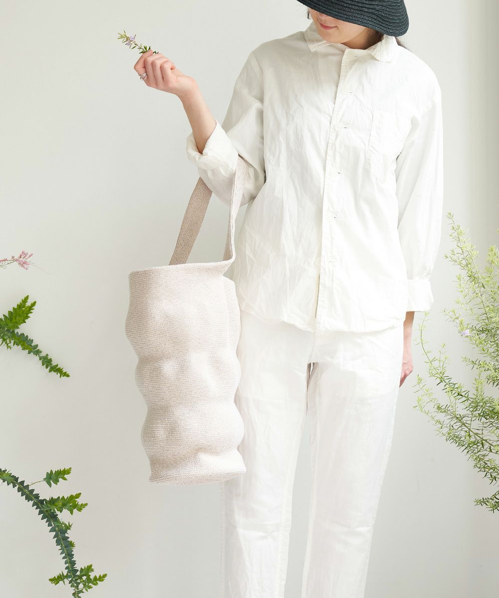 使い込まれた籠バッグをイメージして作られていて、その表情はどこか面白いバランス。 凸凹に縫製するのは、至難の技。 たくさんモノを入れると伸びて、また違った表情になります。