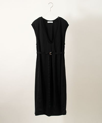 大きく開いた緩やかなVネックから下に入るタックと背面にすっと入るタックのお陰で、縦に伸びるスッキリとしたドレープが着痩せ効果を出してくれます。さらにベルトの位置も高めで、脚長効果もあります。