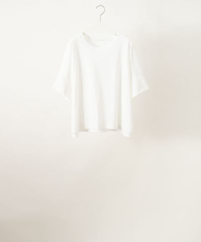 色は真っ白ではなく、やわらかい印象のオフホワイトで、どんなコーディネートにもなじみます。スリットの入った前後差のある裾、肘まである袖、絶妙な襟ぐりなど、細部のデザインがさりげなくオシャレ感を引き立てます。軽く柔らかい素材で肌触りもよく、着ていてとても快適です。